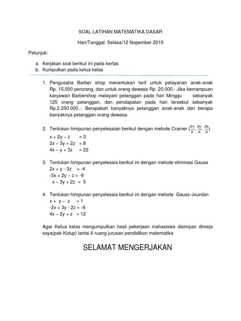 Tetap semangat ya untuk belajar, belajar dan belajar! Pada soal ini diketahui l = 80 cm = 0,8 m dan frekuensi nada dasar 50 hz. Hitunglah volume balok yang mempunyai panjang 10 cm, lebar 8 cm dan tinggi 5 cm! Contoh soal psikotes matematika dasar dan penyelesaiannya. Download & view contoh soal matematika dasar dan penyelesaiannya as pdf for free.