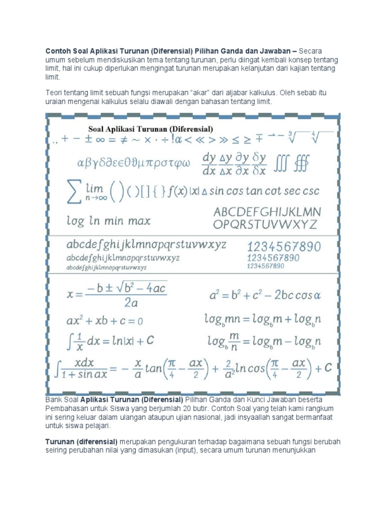 Soal Pilihan Ganda Aplikasi Turunan : Contoh Soal Diferensial Majemuk Dan Pembahasannya - Pembahasan soal ujian nasional (un) sma bidang studi matematika ipa tentang aplikasi turunan dalam pemecahan masalah yang berkaitan dengan maksimum dan minimum.. Nov 29, 2019 · berikut ini merupakan soal dan pembahasan mengenai turunan fungsi trigonometri yang dikumpulkan dari berbagai referensi. Quote by bruce lee saya tidak takut pada orang yang telah berlatih 10.000 jenis tendangan sebanyak. Misal u 2 maka u 0 v cot x maka v cosec 2 x f x u v u v f x 0. Dalam melakukan analisis juga terdapat didalamnya elemen yang akan dilakukan ketika tes analisis sedang berjalan. Semoga bermanfaat untuk dijadikan bahan belajar.